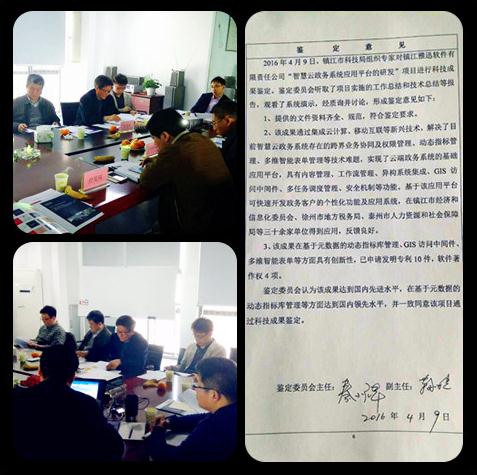 2016年4月9日,鎮(zhèn)江市科技局組織專家對(duì)我公司完成的“智慧云政務(wù)系統(tǒng)應(yīng)用平臺(tái)”項(xiàng)目進(jìn)行科技成果鑒定。鑒定委員會(huì)在審閱了相關(guān)文件資料,觀看了系統(tǒng)演示,經(jīng)質(zhì)疑討論后,對(duì)公司的項(xiàng)目成果給予高度肯定。
